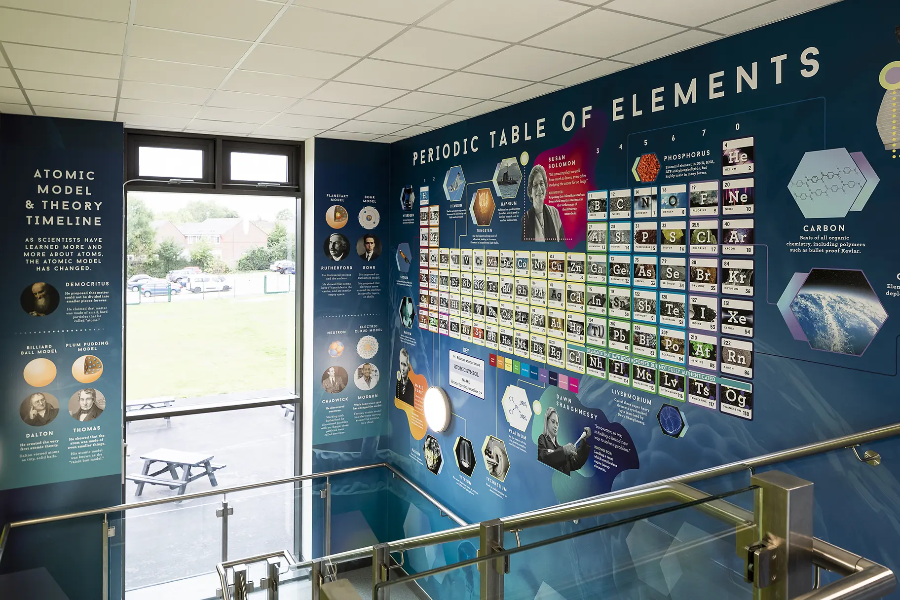 Instead, you could invest in extra large, bespoke and permanent Wall Art to adorn the walls of your Lab. The size of the design makes it accessible and easy to use. Pupils can engage in active learning and walk alongside the artwork to memorise the elements of the periodic table.