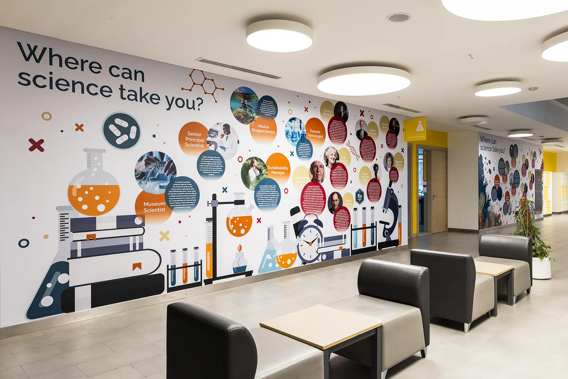Your Science Laboratory will come to life with a future careers backdrop. We’ll use bold images and icons to show the myriad of opportunities that Science can offer. And this is sure to increase engagement from pupils as they’ll be motivated to learn!