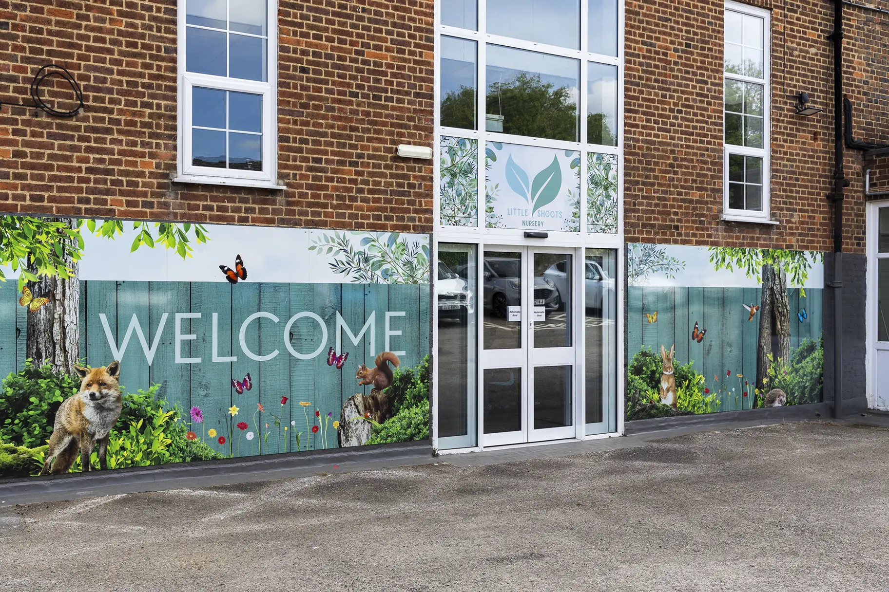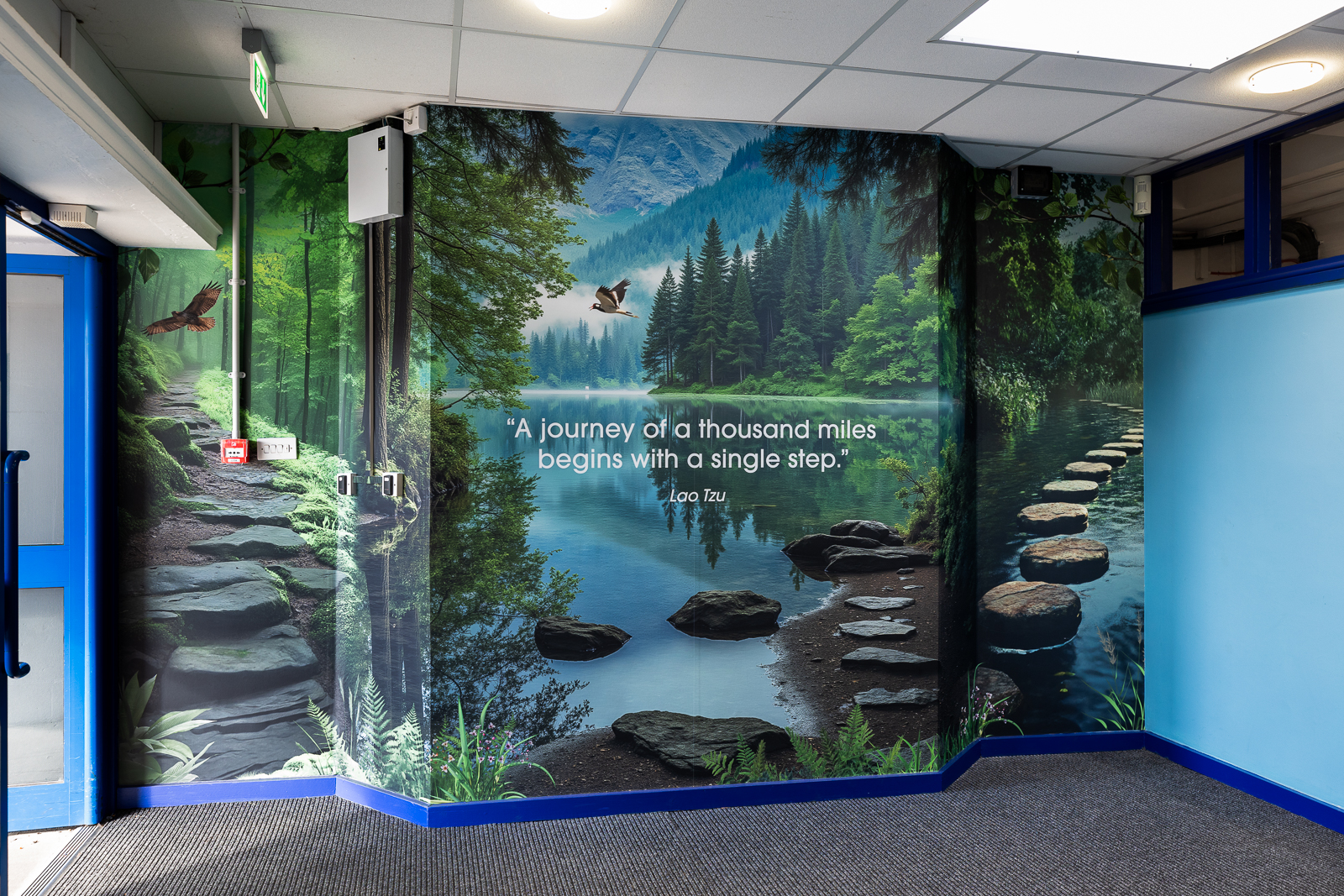 Not all welcome wall designs need to be branded. You might instead opt for a simple nature design to create a calm welcome area.