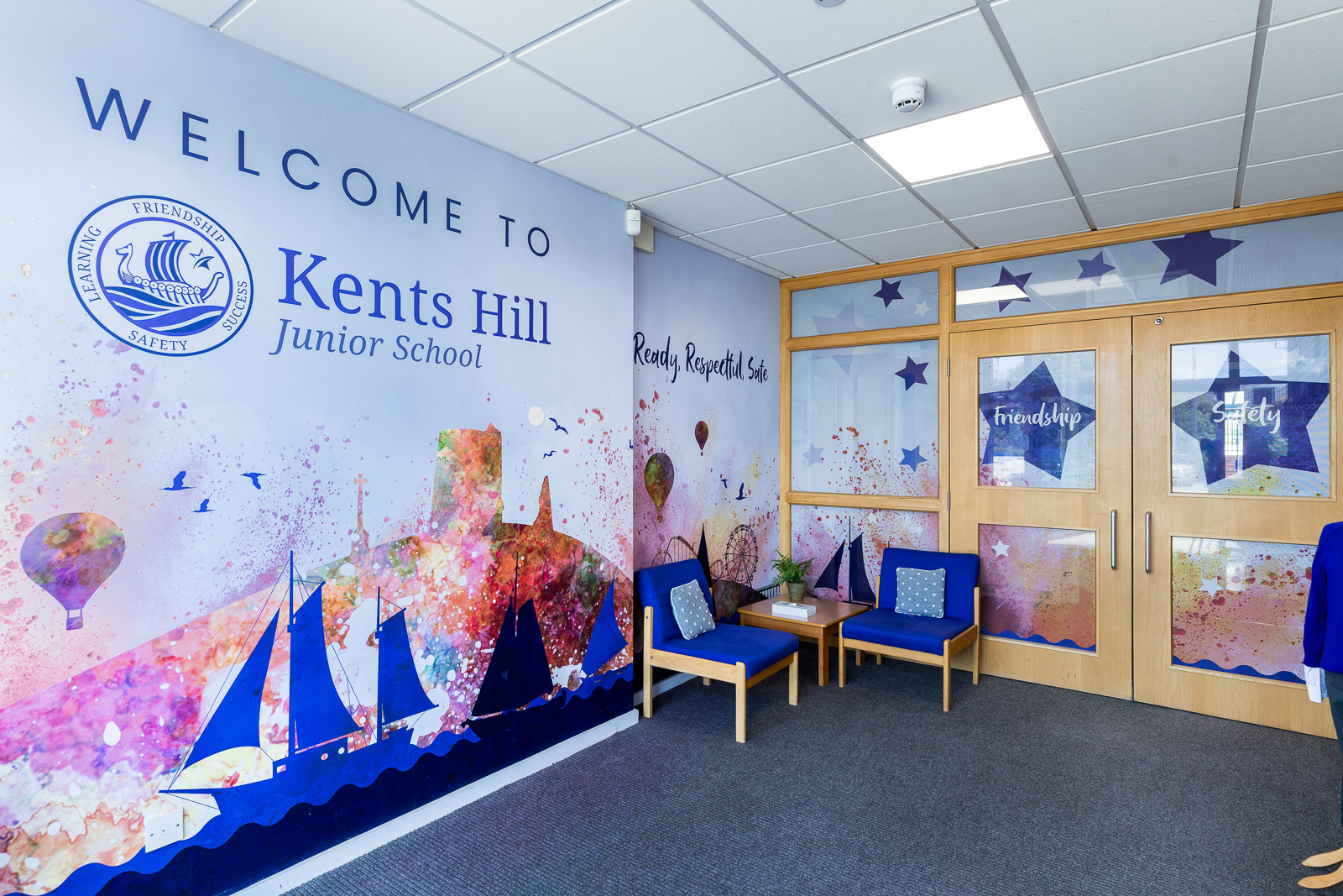 For example, at Kents Hill, the design combines the school’s brand and logo with positive imagery linked to the local community. The result is a vibrant, colourful backdrop that helps families feel at ease as soon as they step inside.