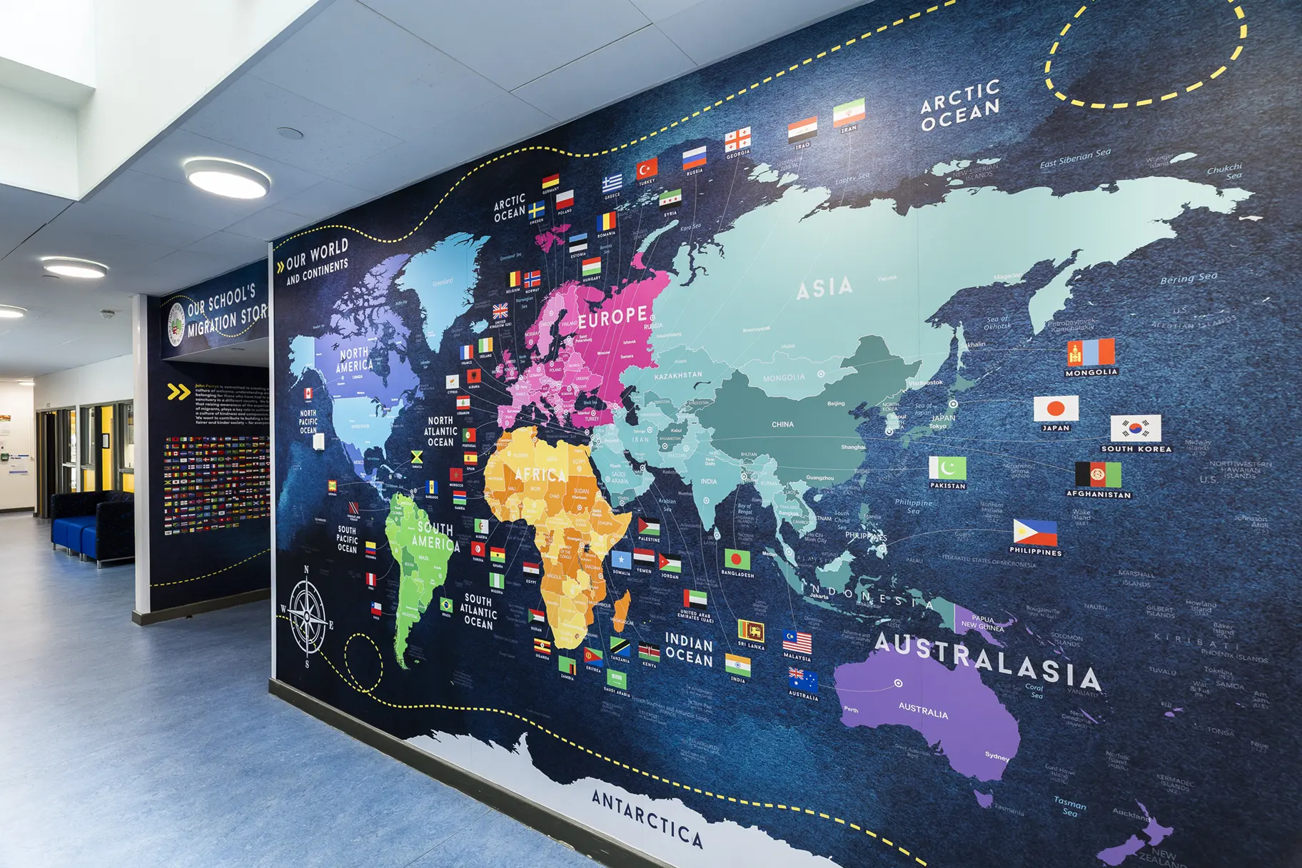 John Peryn Primary School celebrated their pupils’ migration stories on their walls. They used a large, colourful world map and flags to represent the many countries that make up our planet. Then, they featured pupils whose families had moved to the UK from elsewhere.