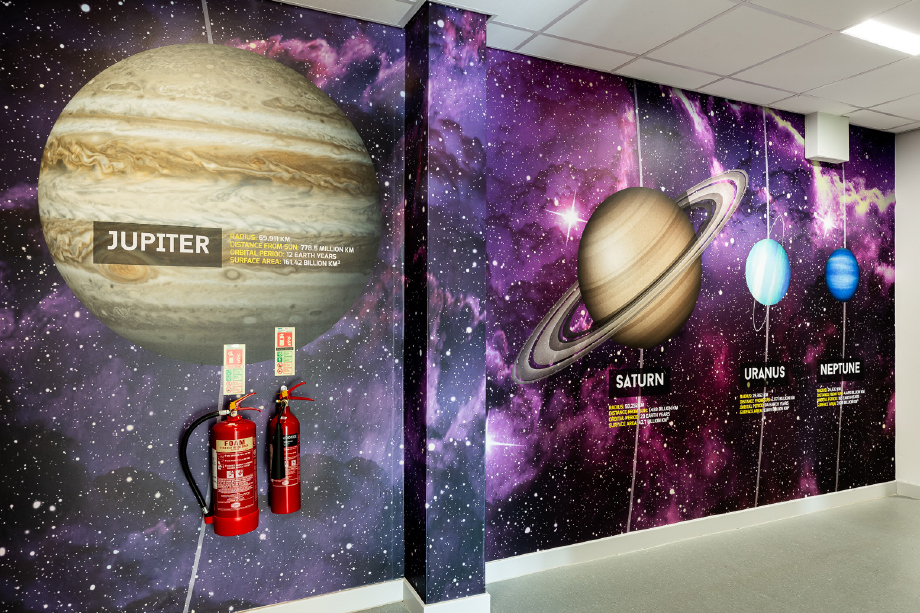 We loved bringing this solar system corridor to life with bespoke designed Wall Art. Space is a very popular topic for schools who want to create an immersive learning environment.