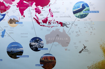 One of the best ways to give pupils an understanding of their place in the world is through visual maps. We focused on large images and a mix of colour when designing this large world map for the school corridor.