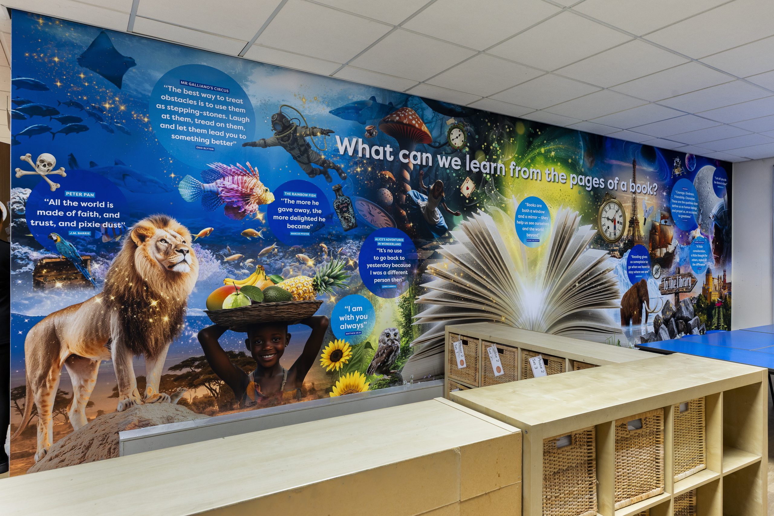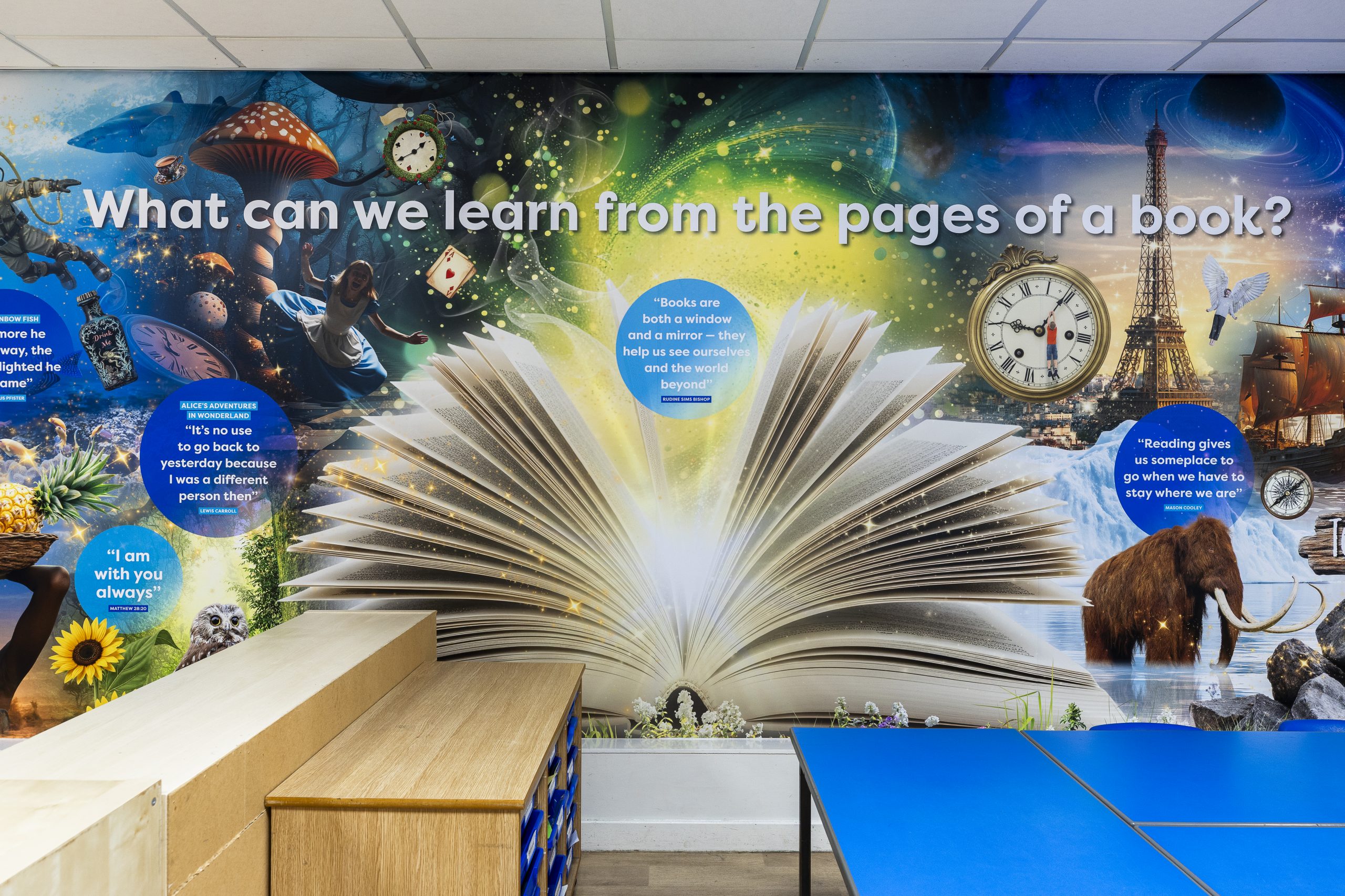 The design sits on a magical backdrop, bursting with colour and interest. Objects fly from the pages of an open book, to spark curiosity in pupils of all ages. We also added quotes from famous authors to inspire and motivate pupils on their reading journey. The closer pupils look, the more they’ll discover. It’s a natural conversation starter, to help pupils build vocabulary and critical thinking.